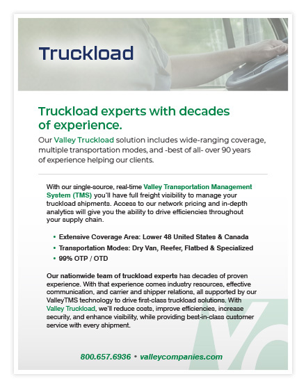 Our nationwide team of truckload experts has decades of proven experience. With that experience comes industry resources, effective communication, and carrier and shipper relations, all supported by our ValleyTMS technology to drive first-class truckload solutions. With Valley Truckload, we’ll reduce costs, improve efficiencies, increase security, and enhance visibility, while providing best-in-class customer service with every shipment.